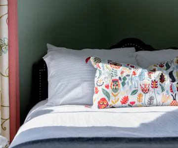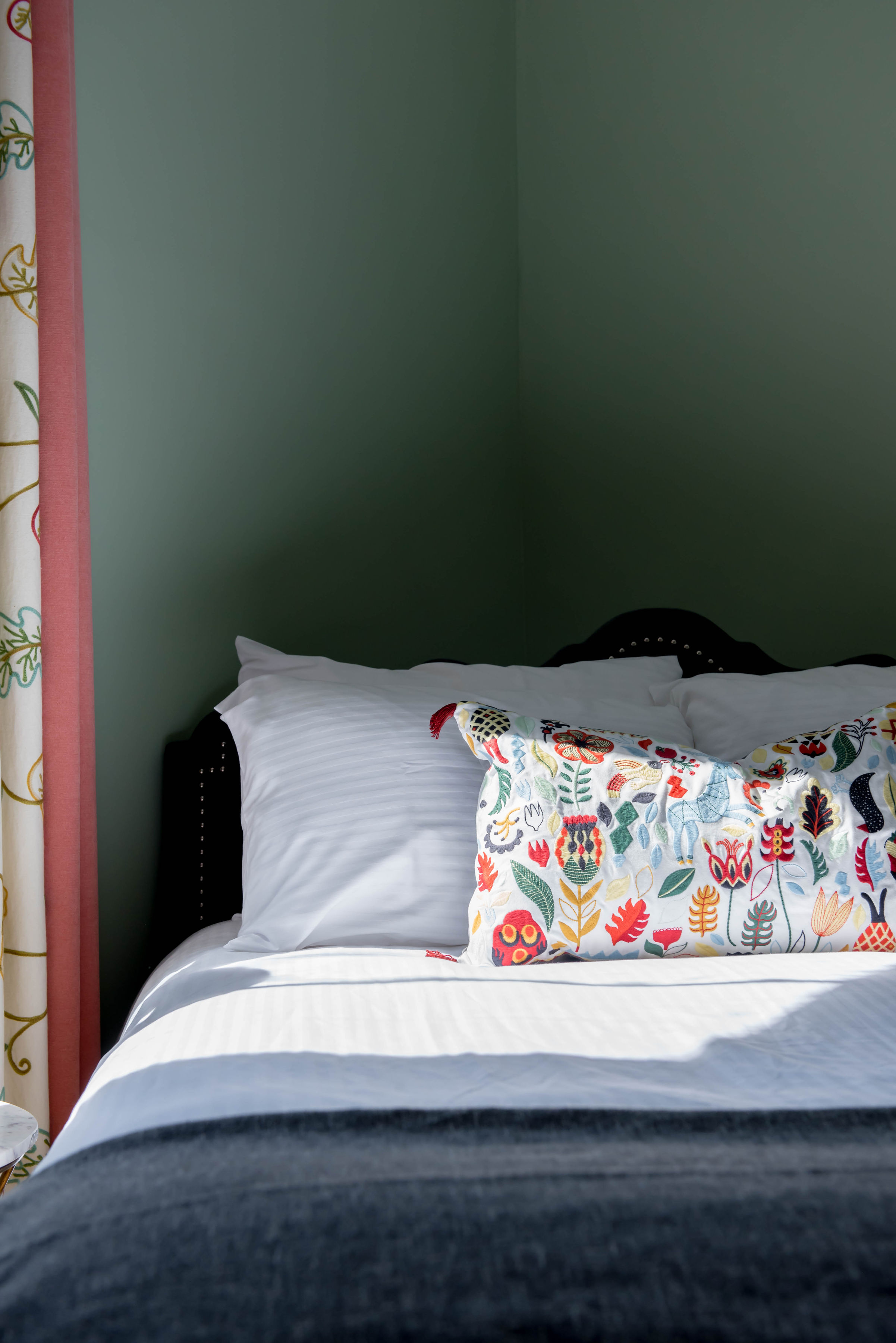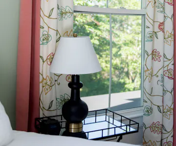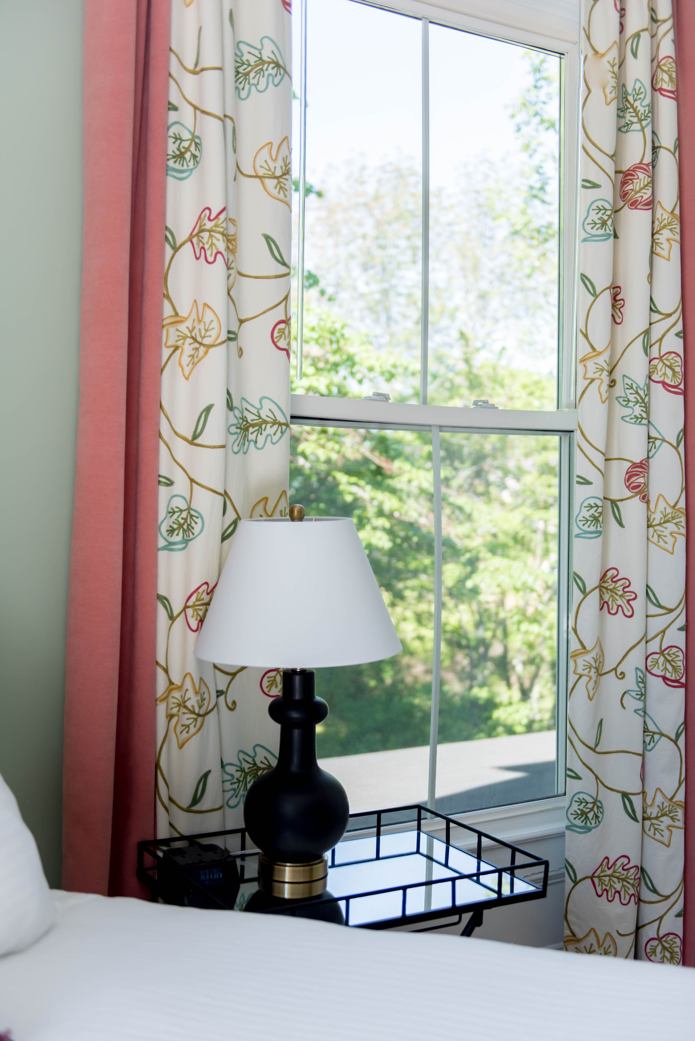 Deluxe King Room with three piece ensuite bathroom. This bright corner room is located on the second floor and features large windows. Room highlights include television with multiple streaming services, air conditioning, free wifi, and luxurious bath amenities.