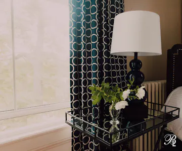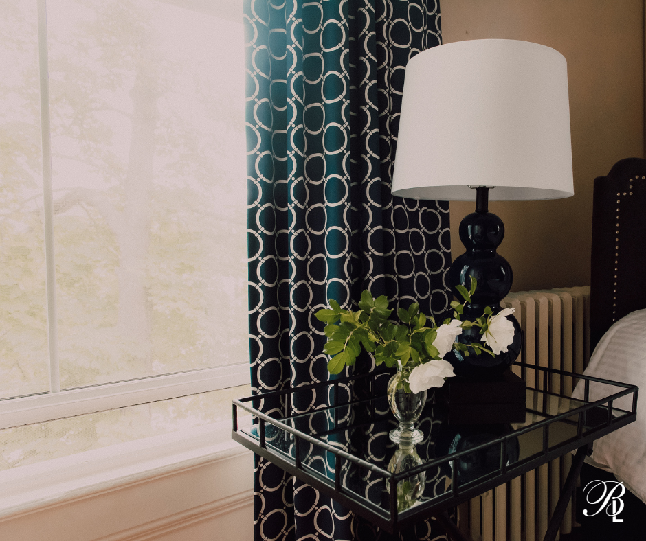Deluxe Queen Room with three piece ensuite bathroom. This bright corner room is located on the second floor and features large windows. Room highlights include television with multiple streaming services, air conditioning, free wifi, and luxurious bath amenities.